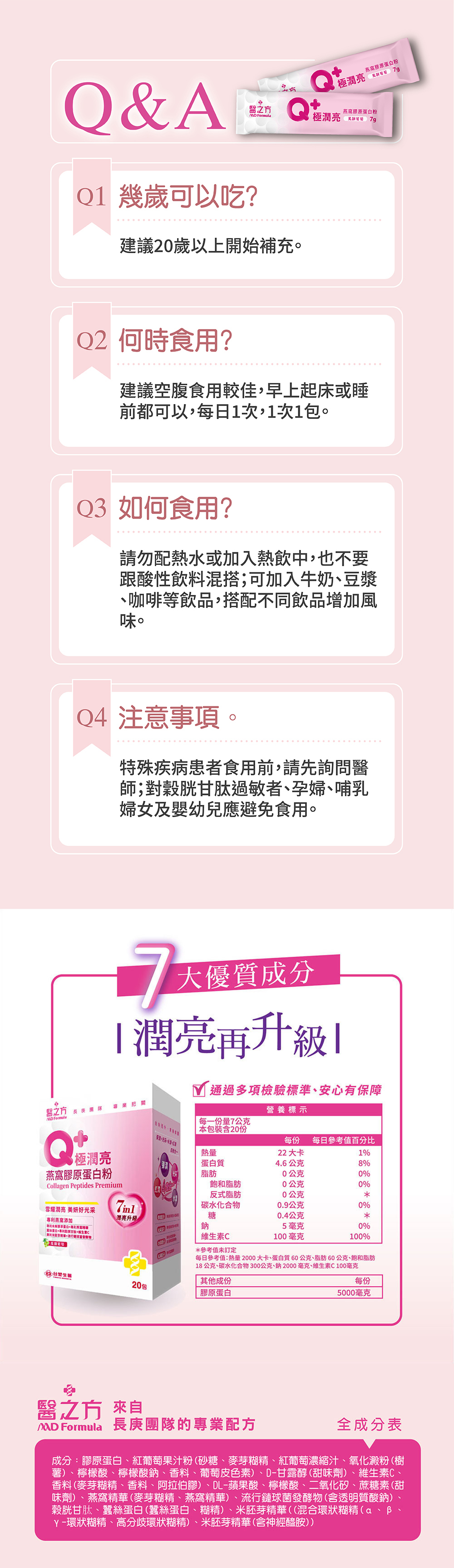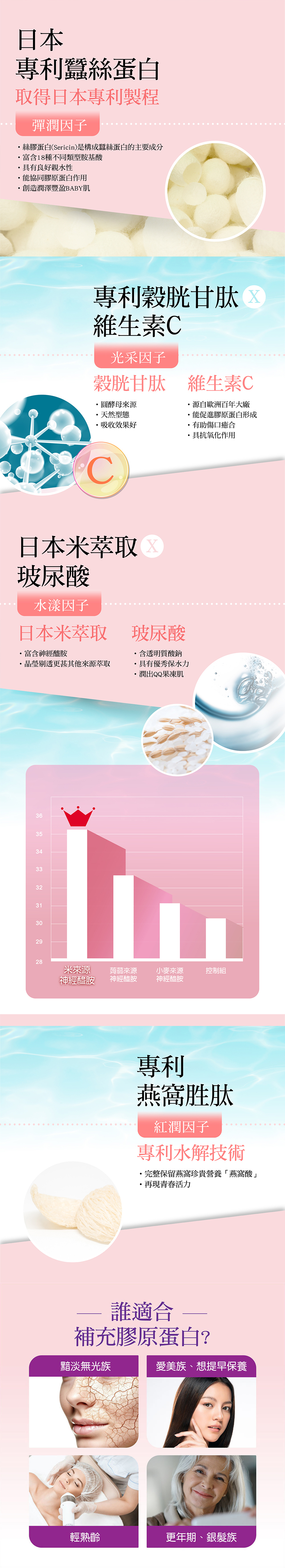 主要成分:專利水解膠原蛋白、專利燕窩精華、、蠶絲蛋白、專利穀胱甘肽、維生素C、專利米胚芽精華、流行鏈球菌發酵物