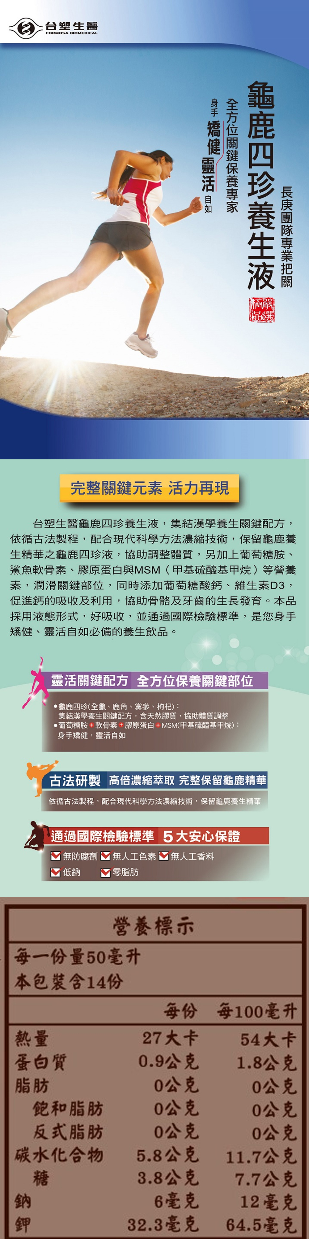 主要成分:龜鹿四珍、葡萄糖胺、鯊魚軟骨素、膠原蛋白與MSM(甲基硫醯基甲烷)、葡萄糖酸鈣、維生素D3