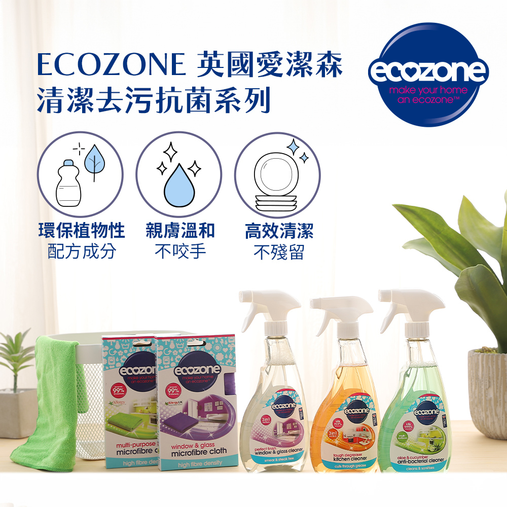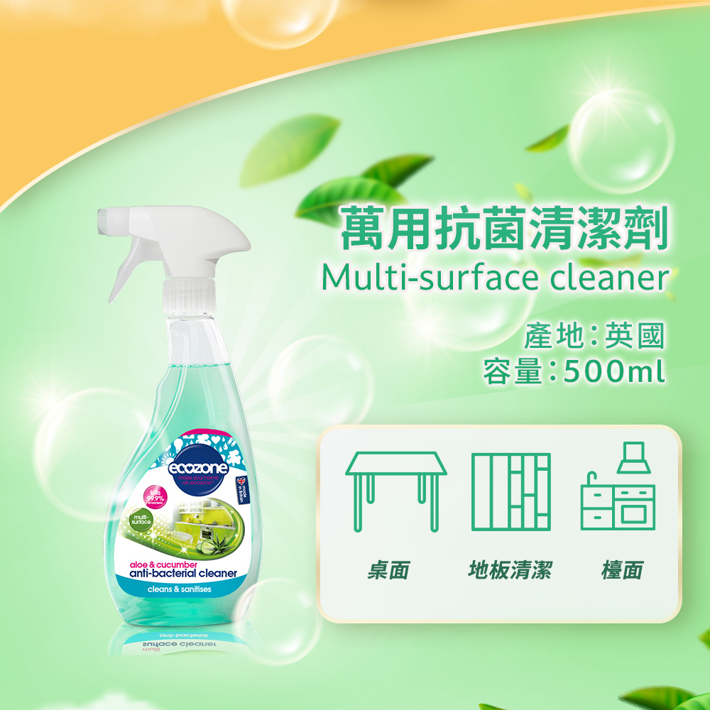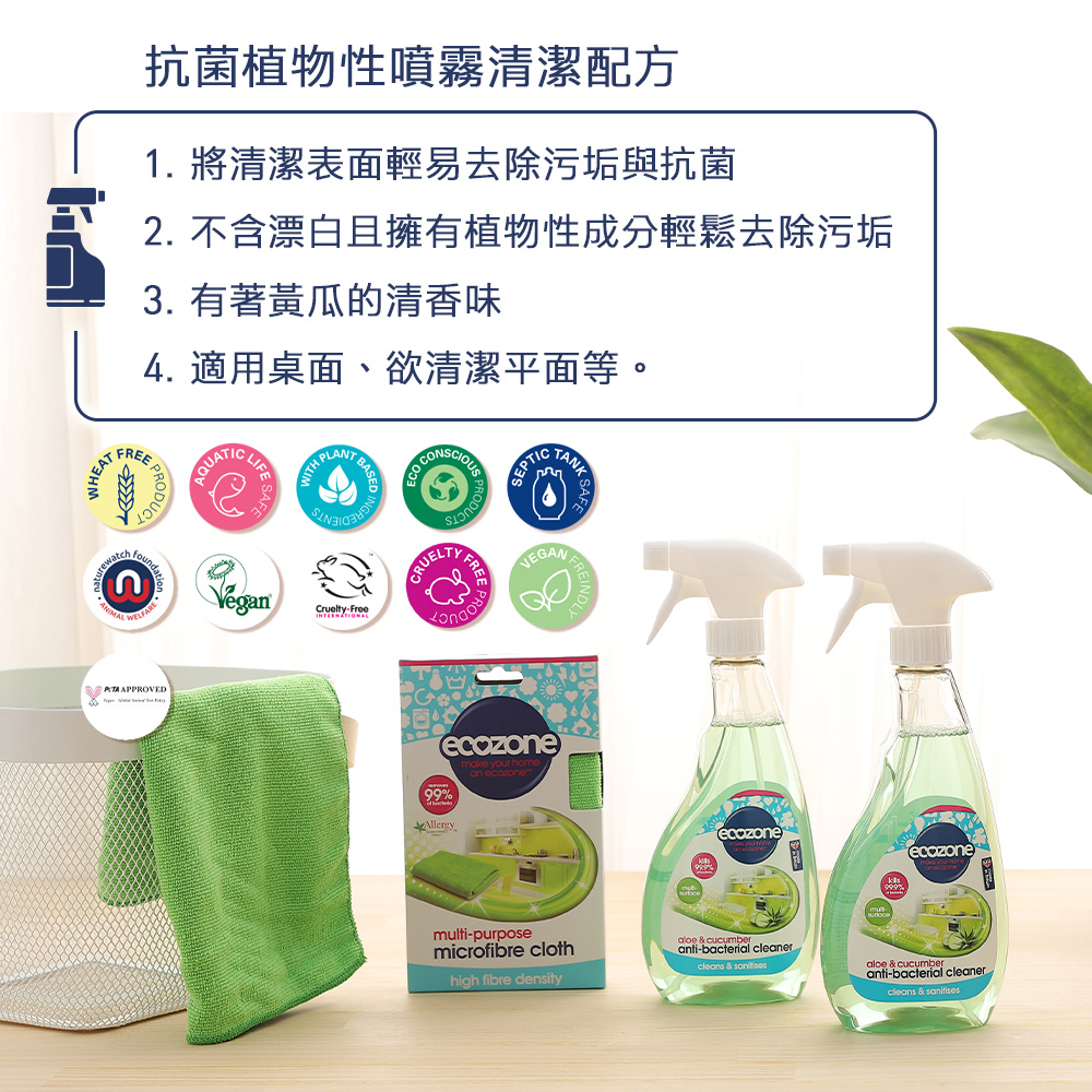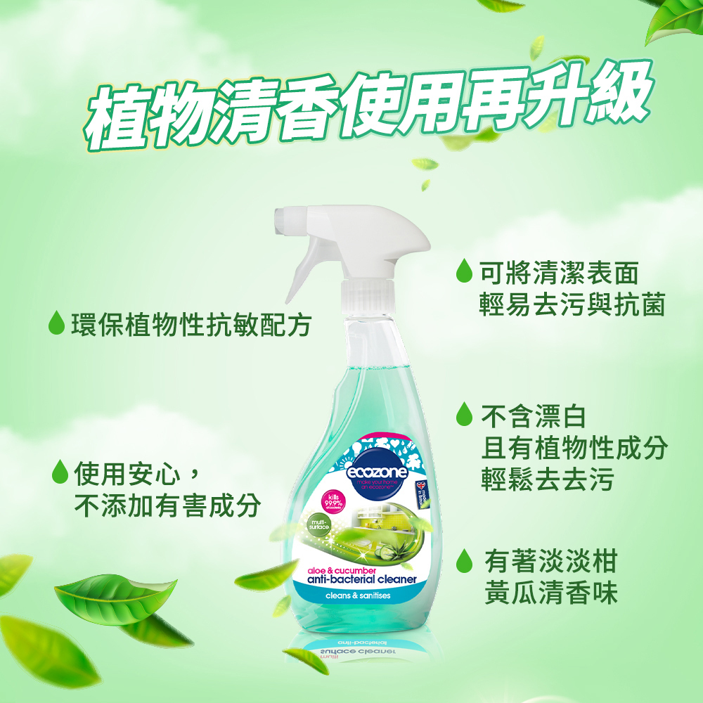 Ecozone的抗菌多表面清潔劑噴霧有效於在清潔和保護家庭周圍的大多數表面,殺死99.9%的細菌,如大腸桿菌和沙門氏菌,同時保持表面消毒和閃閃發光。使用植物性成分去除污垢和污垢。適用於廚房和大多數堅硬表面,包括桌子、檯面和浴室區域。蘆薈和黃瓜的香味肯定會讓家裡聞起來乾淨清爽。
