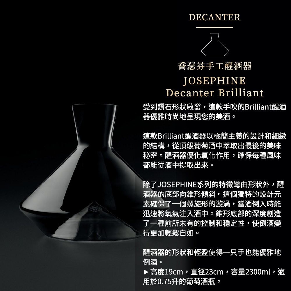 除了JOSEPHINE系列的特徵彎曲形狀外,醒酒器的底部向錐形傾斜。這個獨特的設計元素確保了一個螺旋形的漩渦,當酒倒入時能迅速將氧氣注入酒中。錐形底部的深度創造了一種前所未有的控制和穩定性,使倒酒變得更加輕鬆自如。