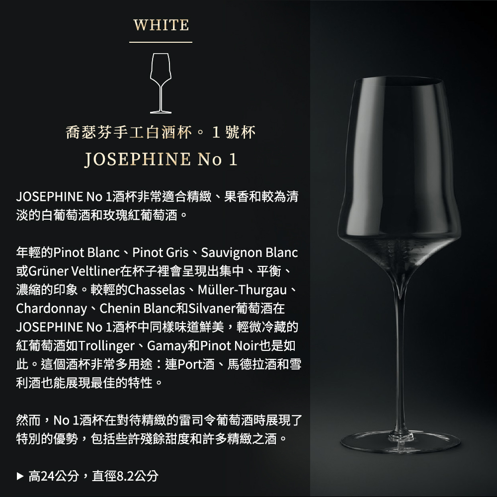 JOSEPHINE No 1酒杯非常適合精緻、果香和較為清淡的白葡萄酒和玫瑰紅葡萄酒。