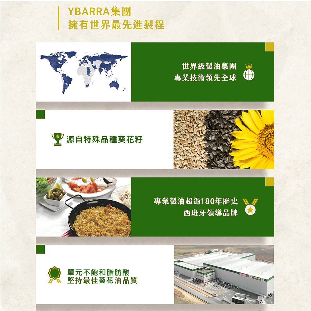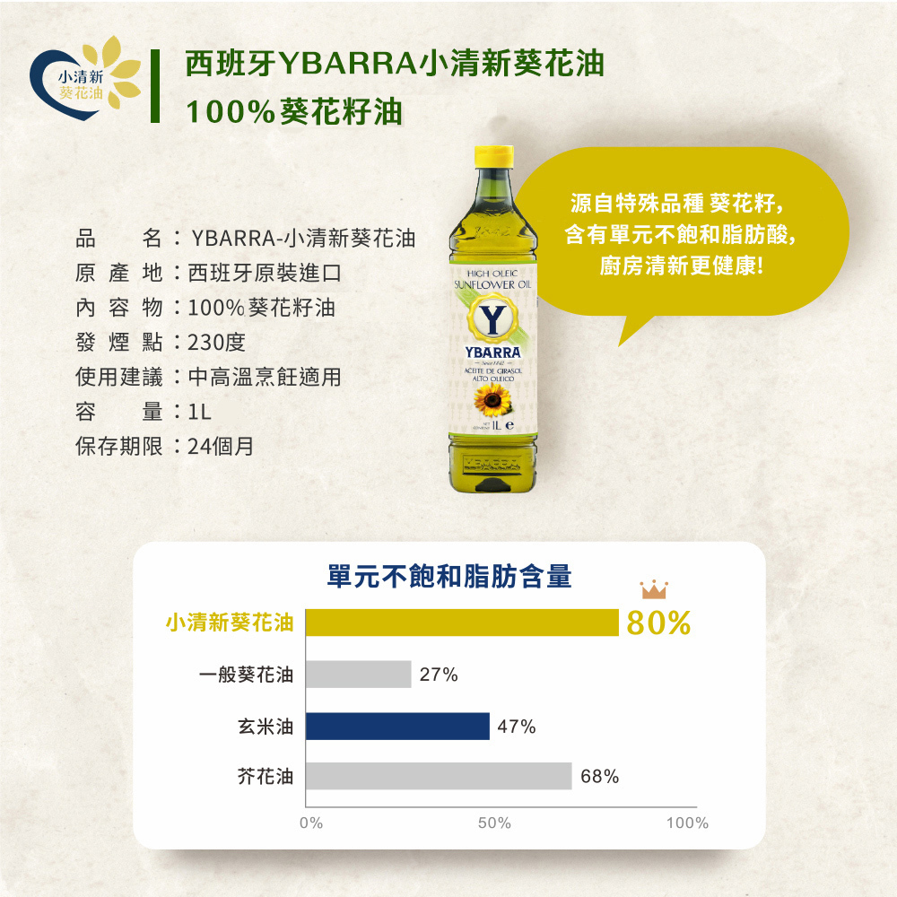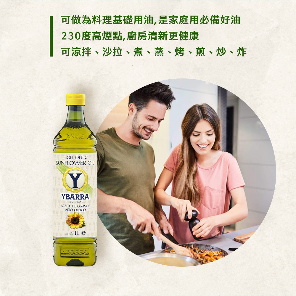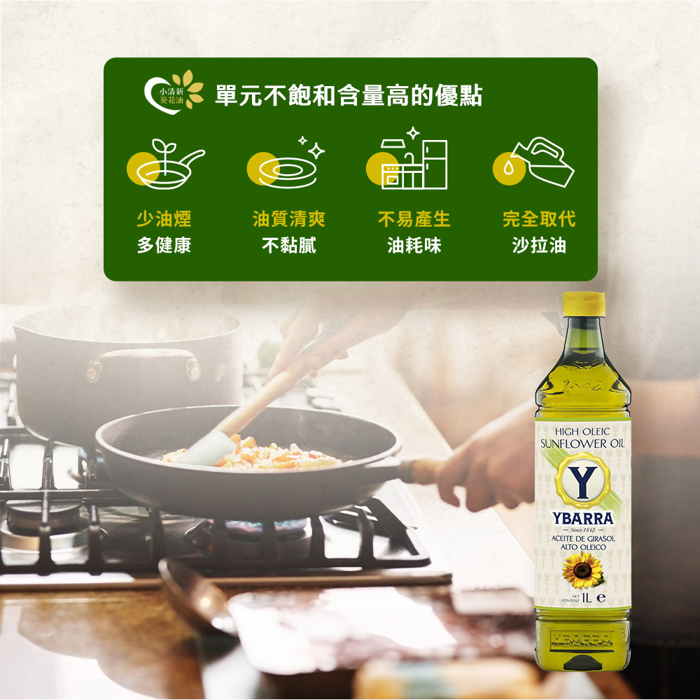 YBARRA 小清新高油酸葵花油,選用天然高油酸葵花品種,富含單元不飽和脂肪酸(Oleic Acid),是一款兼具清爽口感與營養價值的植物油。