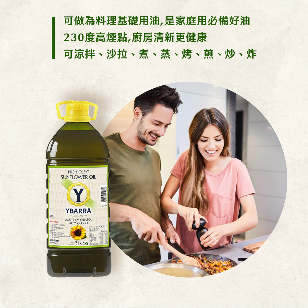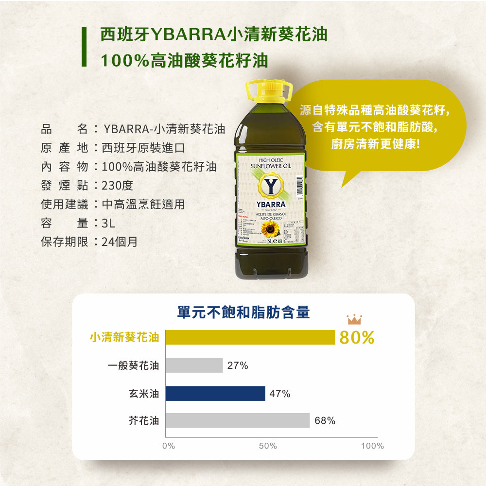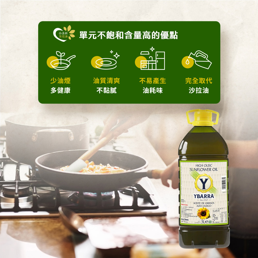 YBARRA 小清新高油酸葵花油,選用天然高油酸葵花品種,富含單元不飽和脂肪酸(Oleic Acid),是一款兼具清爽口感與營養價值的植物油。