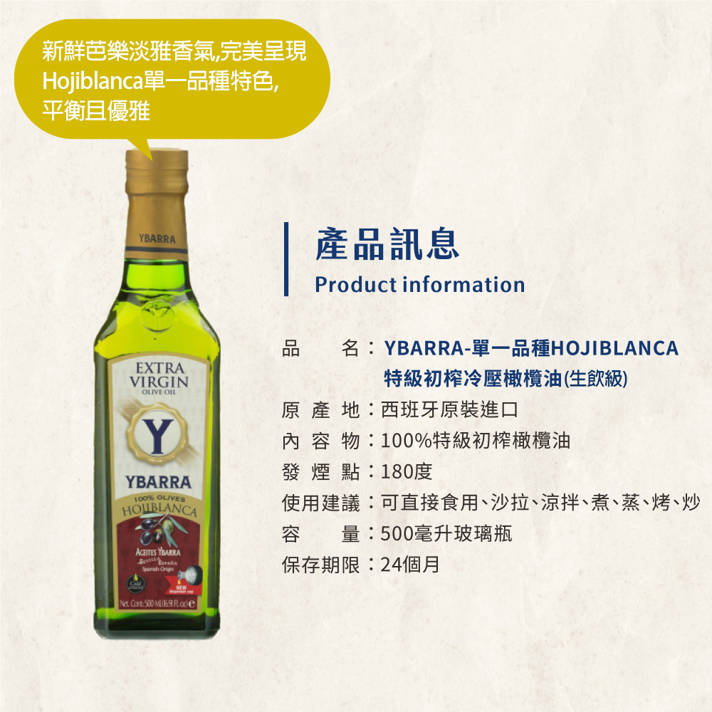 商品品名:特級初榨橄欖油 單一品種HOJIBLA500mlx1瓶